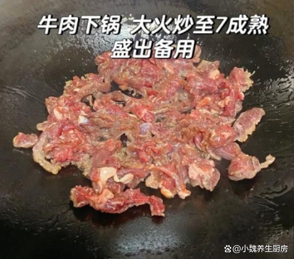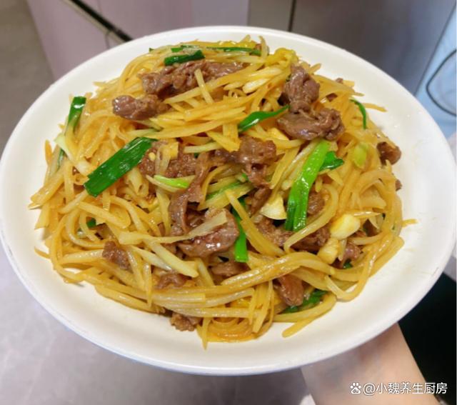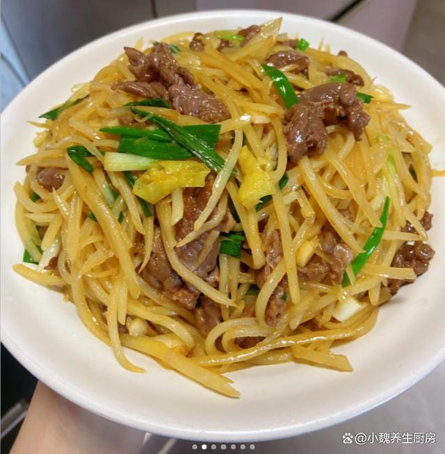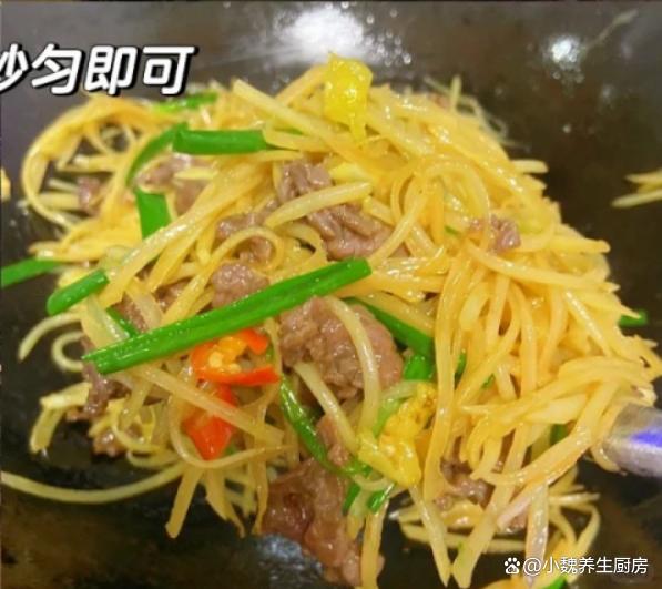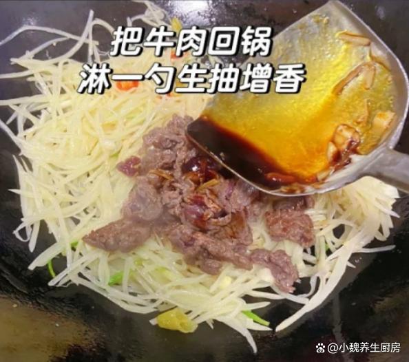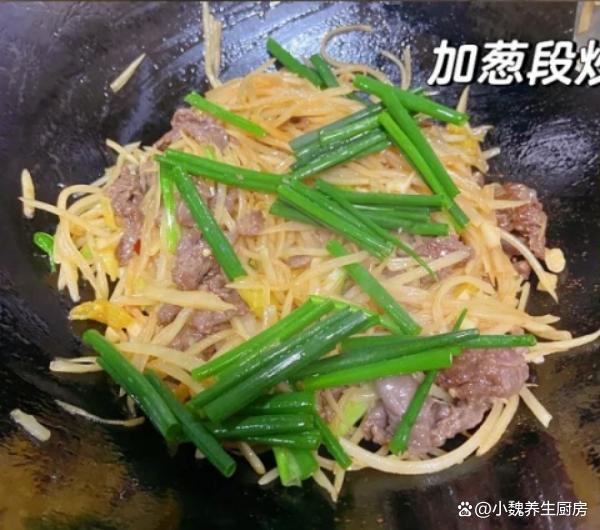 8:倒入之前炒熟的牛肉回锅,加上一勺生抽和半勺蚝油,快速翻炒几下,加上一些葱段点缀,关火盛出,这道泡椒土豆丝炒牛肉就做好了,上桌就被**光,赶快学起来。 泡椒土豆丝炒牛肉是我们家每周必吃的菜肴,选用新鲜土豆,牛肉里脊搭配而成,菜色非常诱人,牛肉肉质鲜嫩,口感非常好,风味独特,吃起来超级有食欲,孩子和老公都爱吃。