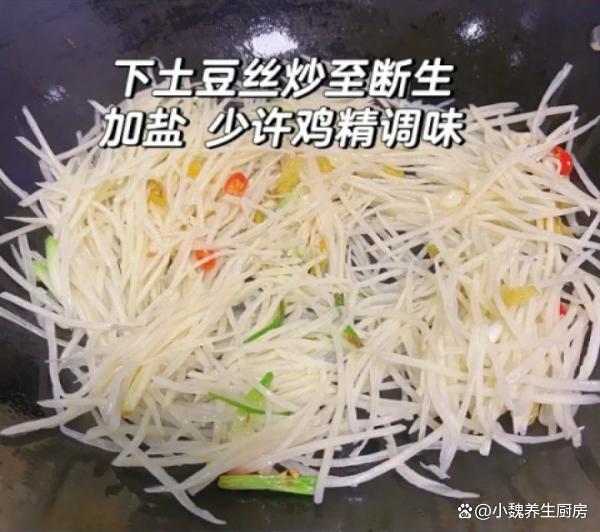 7:锅底继续加上食用油,加上泡椒和葱姜蒜,快速爆炒出香味,倒入土豆丝炒至断生,加上少许食盐和鸡精调味。