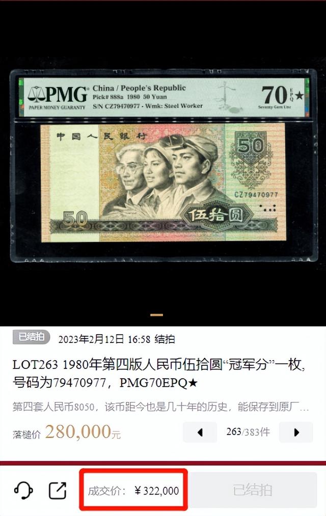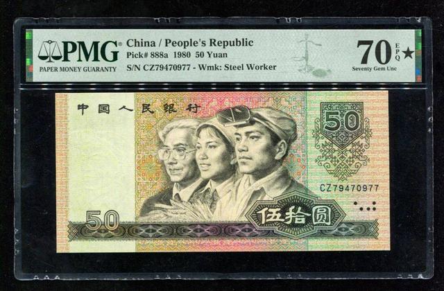 而评级达到70分的评级币,在近期拍出了32.2万的高价,究其原因还是由于品相极其完美,这样的品相据估计全世界也不会超过10枚,上涨的幅度真的是十分惊人,无愧为四版纸币的币王,值得注意的是由于80年50元价值非常高。