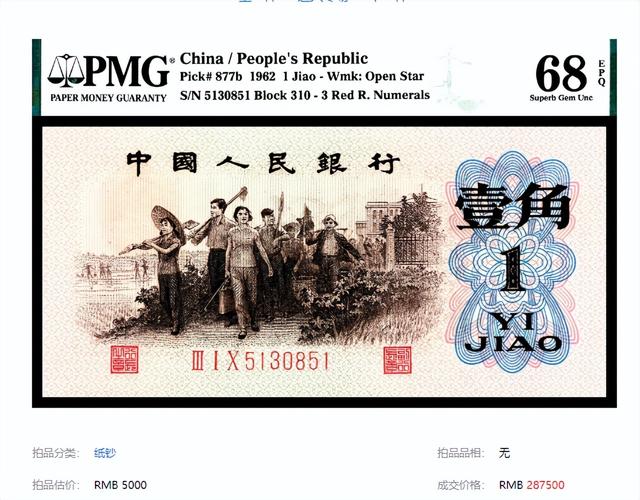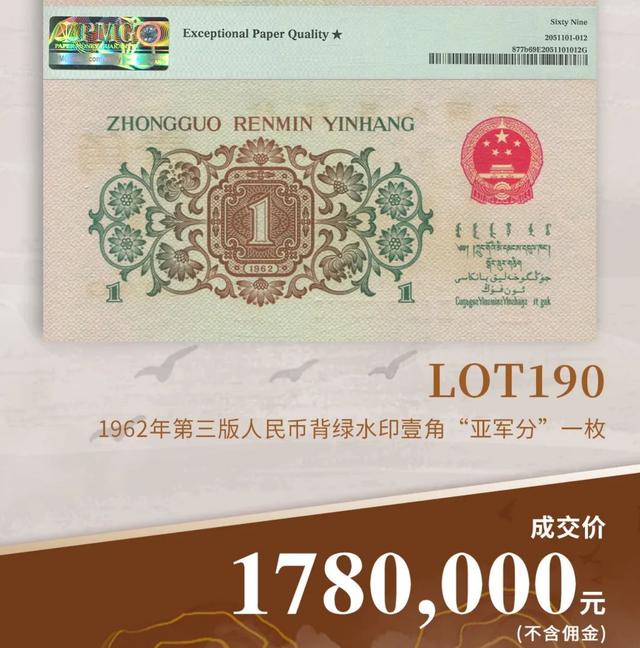 其中最为亮眼的,可能有很多朋友非常熟悉,它是1962年的1角纸币,但拍了101.2万!更为关键的是,在前段时间,这种1角甚至还拍出了178万,创下新高 这种年份的1角,绝对称不上罕见,即便是百科网家里,也能找到好几张。