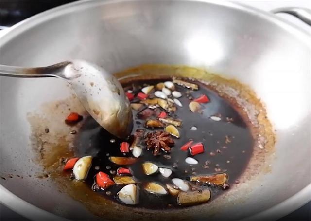 5.接着起锅,加少量的油,加入姜蒜,小米辣,花椒,八角炒香,再把料汁倒进去煮开,然后关火放凉就可以了。