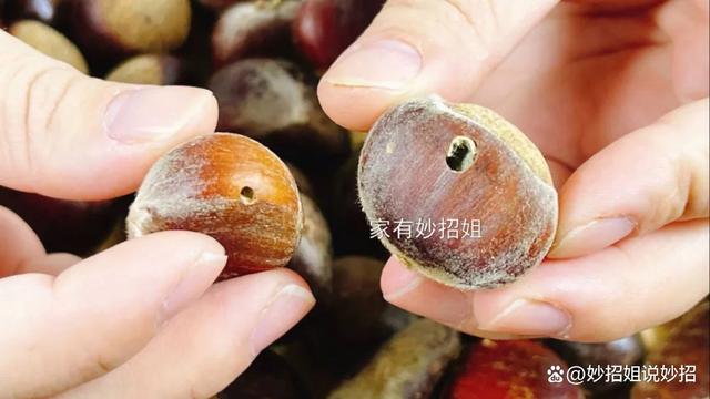 第三:看破损。 在买板栗时,我们还要将板栗拿在手上仔细检查一下表面是否有破损。如果发现板栗的表面有小孔洞,哪怕很小的一个洞,这都表明里面藏着虫子,我们就不要购买了。此外,我们还可以将板栗拿在手上摇一摇,新鲜的板栗摇晃起来没有任何感觉。但如果摇晃时,能明显感觉里面的果肉在晃动的,就说明板栗已经放置了比较长的时间,果肉和果壳已经脱离,这样的板栗水分流失,已经不新鲜了。
