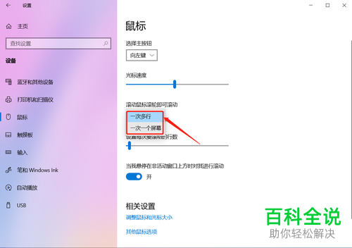 6. 最后根据下图箭头所指,还可以按照需求设置【滚动鼠标滚轮即可滚动】参数,选择一次多行或一次一个屏幕。