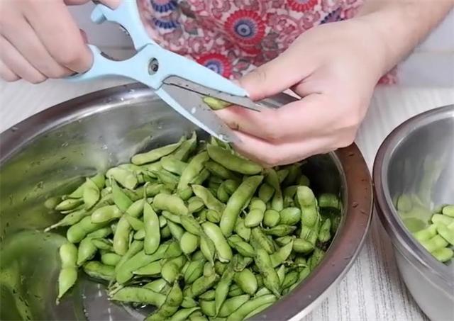 2.洗好之后,我们把毛豆的两端都剪一下,这就是第一个小技巧,这样可以让毛豆更好的入味儿。