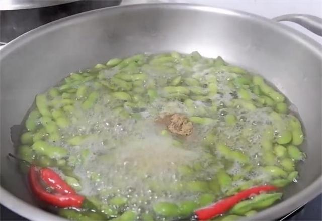 4.把毛豆下锅开煮,这里有一个煮毛豆的小技巧,就是煮的时间一定要控制好,一般水开之后,5到8分钟就可以关火了,煮的时间太久,毛豆的表皮会变黄,豆子也软了,就不好吃了,时间到了之后,再加入1勺十三香,搅匀之后,就可以出锅了。