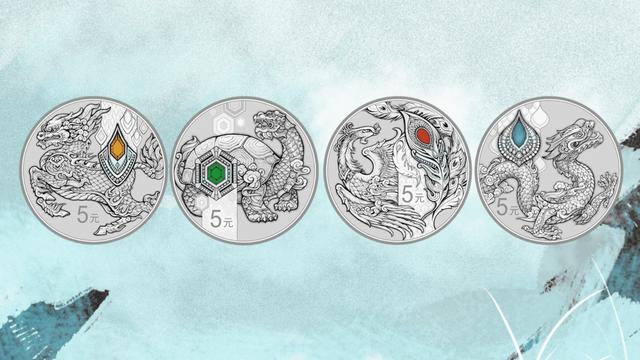 这套包含金币和银币各4枚的金银纪念币,分别在币面上展现龙、凤、麟和龟。 其中金币的设计中规中矩,没啥亮点。 但银币堪称惊艳。 4枚不同瑞兽的银币,镶嵌了4种不同颜色的宝石,看上去非常抓人眼球, 这套纪念币还有不少亮点。 首先,它们是新题材新龙头。这个题材的寓意还深受群众喜爱。