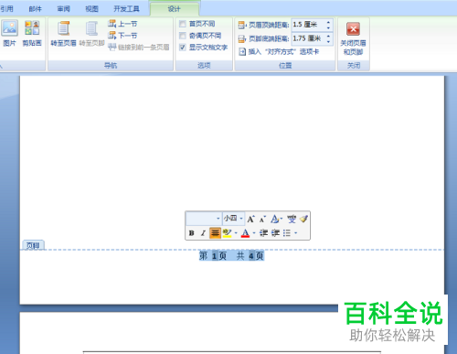 五、双击文档虚线以外的空白处,即可得到“第1页 共4页”的页码格式了。选择页码的字体,点击弹出界面中的“居中”选项(可自由更改文字大小、类型、颜色等): 六、重复第五步,就可以得到一个第几页 共几页的完整文档页码格式了: