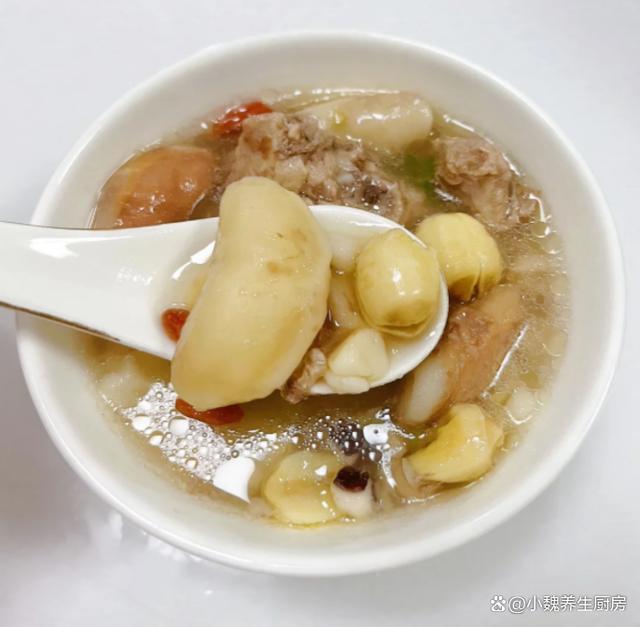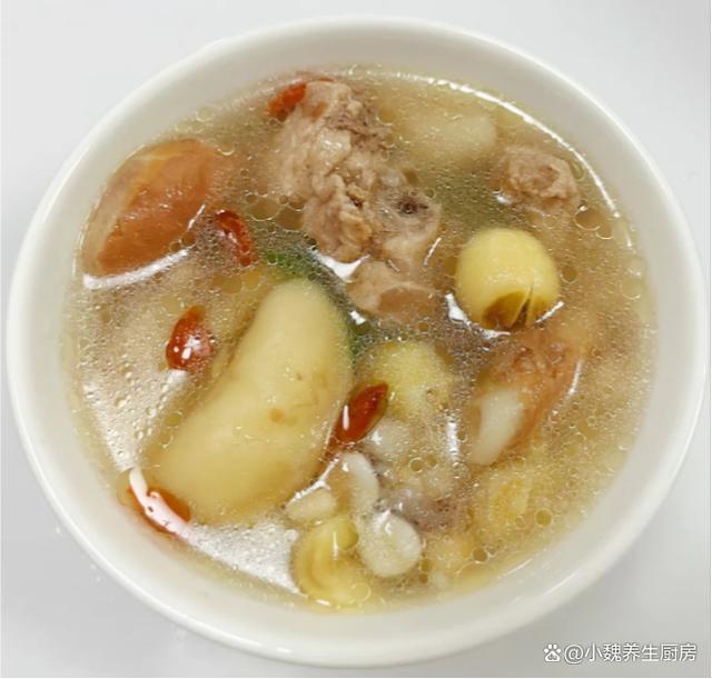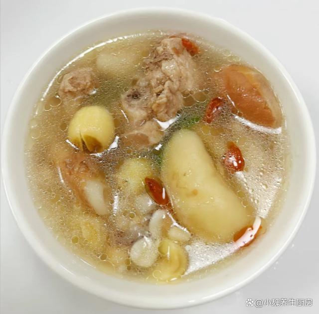 5:准备好煲汤的锅(高压锅可以节省时间 ),放入处理好的排骨,放入菱角,芡实,薏米,莲子等食材,加上适量清水,开大火炖煮40分钟。 6:转小火炖煮20分钟,让汤汁煮到变色为止,放入洗净的枸杞子,调入少许食盐和胡椒粉,最后撒上芹菜或香菜点缀,焖煮半分钟出锅,这款菱角莲子薏米排骨汤就制作完成了。 菱角莲子薏米排骨汤是秋天祛湿的汤品之一,主要选用菱角,芡实,薏米和排骨炖煮而成,里面含有丰富的营养,汤品特别鲜美滋补,还可以赶跑体内的湿毒,补肾健脾,对肠胃也很有好处,不懂吃可惜了。网友们,你们是否喝过这款菱角莲子薏米排骨汤呢?(文中配图都出自网络)