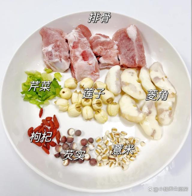 进入金秋九月,天气从炎热转变到凉爽,最近一直在刮风和下雨,秋雨以后就慢慢变冷了,最近好多地方都在下雨,雨水变多以后,空气里都是湿漉漉的,人们长期生活在这种环境,就会出现全身乏力,甚至都头晕眼花的情况,这个时候要正确面对,平常要多参加运动,多喝各种鲜美的汤品,帮助调理身体,让身体越来越健康。今天为网友们推荐一款祛湿的汤品——菱角莲子薏米排骨汤,主要选用菱角和几种食材搭配,营养全部都在汤品,每周给家里人煲一锅,远离湿气,全身轻松。许多人肯定没有喝过这款菱角莲子薏米排骨汤,快一点跟着小编具体了解下吧。湿气最怕喝“这汤”,九月要多喝它,祛湿又健脾,早食早受益。  【菱角莲子薏米排骨汤的具体做法】 挑选一些食材:挑选新鲜菱角350克(菱角是水中特别常见的蔬菜,口感非常脆甜,富含有多重营养成分,菱角可以蒸,煮和炒着吃,到各种食材是绝配),优质干莲子30克左右,冷水少许,薏米20克,芡实25克左右,老姜一大块,新鲜排骨400克左右(排骨是猪骨最受欢迎的部位,吃法会非常多,我们家喜欢搭配各种食材煲汤,排骨汤巨鲜美,滋补身体),冷水足量,枸杞子少许,芹菜少许,食盐若干,少许料酒,其他调味品。 正确制作顺序: 1:提前准备好菱角,莲子,薏米和排骨等食材,先把生姜去皮洗净,切成一些片状,香菜或芹菜叶子洗净切成小段。2:先把菱角去壳,洗净备用,干莲子提前温水泡发,取出里面的莲子心,芡实提前洗干净。3:将薏米提前洗干净,用温水浸泡几个小时,也可以放在冰箱冷藏一晚上,排骨也需要剁成块,然后用清水冲洗掉血水,备用。4:起锅,加上适量冷水,倒入洗净的排骨,放入一些姜片和葱段,加上少许料酒,把排骨炖煮一会儿,去掉表面的血腥物质,准备好其他炖汤的食材,开始烹饪这道菱角莲子薏米排骨汤。