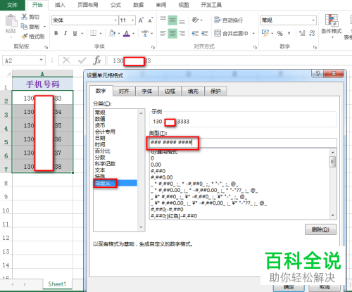 3. 第三步进入【设置单元格格式】页面后,根据下图所示,先点击左侧菜单栏中【自定义】选项,然后在右侧页面中【类型】选项下的输入框中输入【### #### ####】,点击【确定】选项。