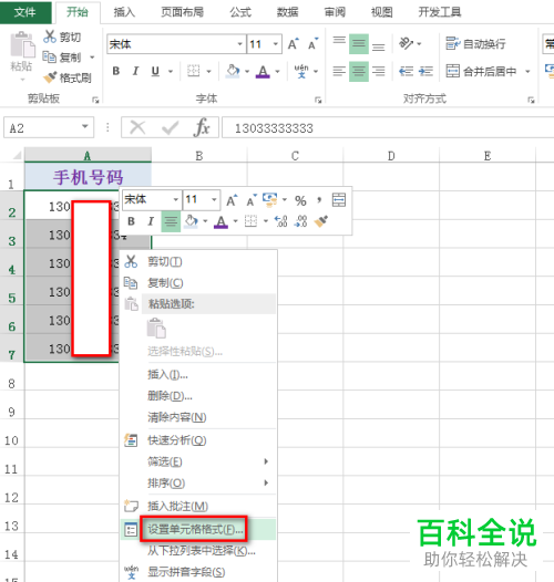 2. 第二步将所有电话号码选中后单击鼠标右键,根据下图所示,在弹出的菜单栏中点击【设置单元格格式】选项。(www.ws46.Com)