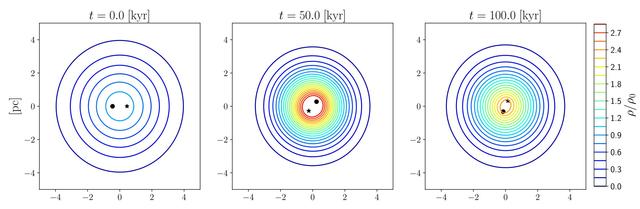 为了检验这个假设,他们进行了一些数值模拟,模拟了黑洞双星在超轻暗物质晕中的演化。他们用施瓦西度规来描述黑洞的引力场,忽略了黑洞的自旋和相对论效应,并且用薛定谔-泊松方程来描述ULDM的波函数和引力势。他们的结果表明,超轻暗物质波可以导致黑洞双星的快速轨道衰减。 |