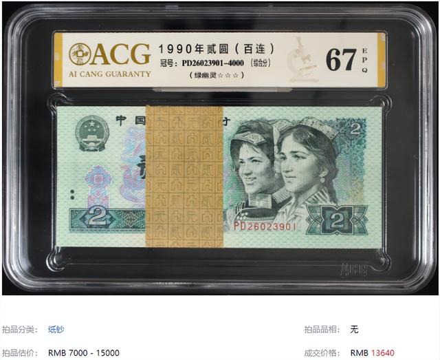 比如在近期的拍卖会中,一刀1990年的2元纸币,就拍出了1.3万多。 上面这种是比较稀少的绿幽灵。 而普通的90年2元,整捆的报价也达到了2万附近,相比7月初也有了明显的上升。除此之外,1980年的2元,同样有较为出色的表现。