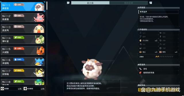 棉悠悠:棉悠悠是前期常见的一种帕鲁,外形类似绵羊,非常的可爱。它的工作适应性上有手工业、搬运和牧场,前期可以给玩家带来丰厚的羊毛收入,羊毛可以转化成布料,布料则是前期基础的支援之一。另外手工业的技能加成也让它可以帮助玩家制作一些产品和建筑。