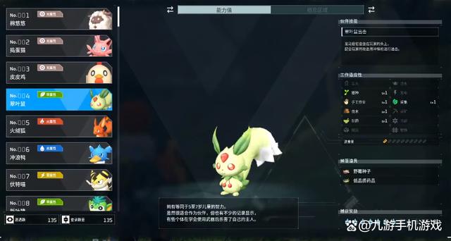 翠叶鼠:前期工作能力最为全面的帕鲁,它的工作能力有播种、手工作业、伐木、制药、采集,几乎覆盖了基地内的所有任务。比如播种和采集配合就可以完成庄稼的自动种植和收获,可以大大节约我们的劳动力。除了基地,后期翠叶鼠还可以前往医药站和伐木厂进行工作,是性价比极高的帕鲁。