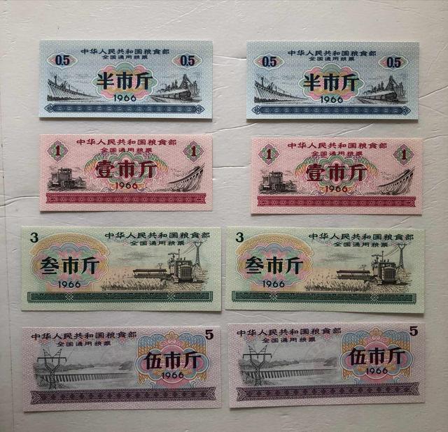 首先咱们先看一下1966年五市斤全国通用粮票的发行背景,据有关资料显示发行1966年版本全国通用粮票,是因为1965年版本的全国通用粮票有错误,就是1965年全国通用粮票背面,使用说明中有一个标点符号错了,为了维护国票形象粮食部在1967年10月13日,发出关于发行1966年新版全国通用粮票的通知,这就是发行1966年全国通用粮票的原因,1966年全国通用粮票分为半斤、一斤、三斤和五斤四种面值,按类型又可分为有水印和无水印两种类型。