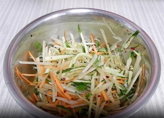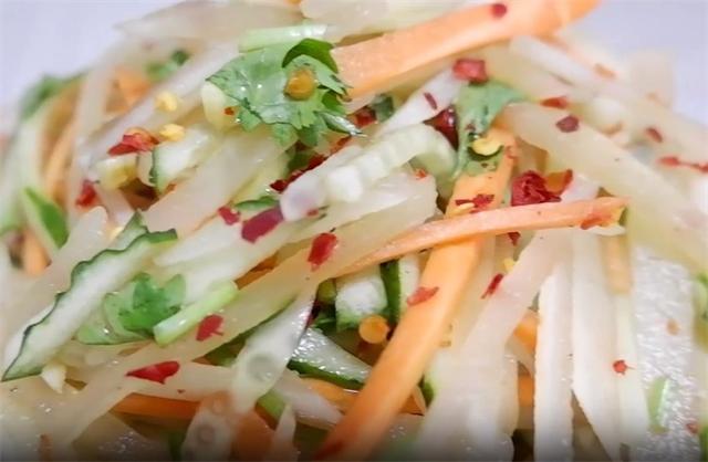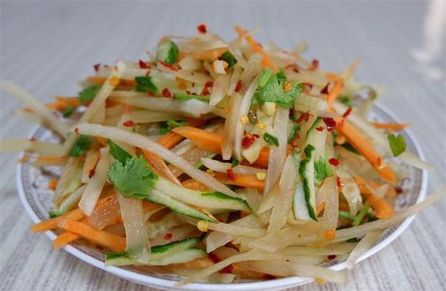 准备食材: 雪莲果、黄瓜、胡萝卜、香菜、蒜末、辣椒粉、盐、味精、酱油、陈醋 具体做法: