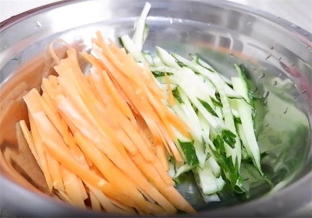 2.然后再把半根黄瓜切丝,少量的胡萝卜切丝。