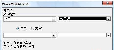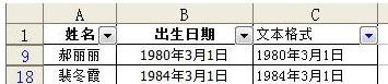 以筛选出生日为3月1日的人员名单为例。先对日期列设置自动筛选:选择B1单元格,单击菜单“数据→筛选→自动筛选”第一行各单元格中出现筛选下拉箭头。单击日期列的筛选箭头,选择“自定义”,弹出“自定义自动筛选方式”对话框,在“文本格式”下选择“止于”或“结尾是”。如果是用分列的方法将日期转换为文本,在其后的文本框中输入“3-1”,如果是用复制粘贴的方法将日期转换为文本,则输入“年3月1日”。直接输入“3月1日”,Excel会将其作为日期处理,得不到正确的筛选结果。