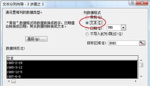 方法一:修改日期格式 Excel筛选某时期步骤一:由于B列所显示的日期中同时包含了年、月、日,不便按月日进行筛选,所以筛选前需修改日期格式,让日期中只显示月日。方法是选择B列的所有日期,按快捷键Ctrl 1,打开“设置单元格格式”对话框,选择“数字→日期”,在右侧的“类型”下选择不包含“年”的日期格式,如“3月14日”,再进行自动筛选就可以了。 方法二:将日期转换为文本 方法是将B列中的日期格式转换为文本,然后对文本进行筛选,这种方法可以在同时显示年月日的情况下进行自动筛选。 Excel筛选某时期步骤一:将日期转换为文本 可以用下面的两种方法: 分列法:选择B列中的所有日期,单击菜单“数据→分列”,弹出“文本分列向导”对话框,单击两次“下一步”,在“3步骤之3“对话框中选择“文本”,单击“确定”。