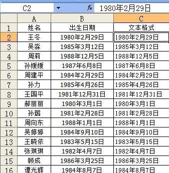 Excel筛选某时期步骤一:将B列中的所有日期复制到记事本中,然后再粘贴回Excel中。注意粘贴回Excel前需将被粘贴的区域设置为文本格式。这种方法可以保留原日期的显示样式,例如原日期显示为“1980年2月29日”,粘贴后也为“1980年2月29日”,下图将日期粘贴到C列:
