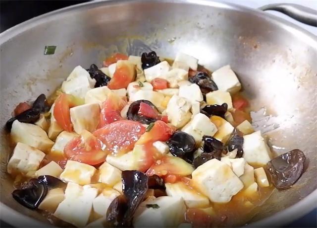 准备食材: 豆腐、素火腿肠、木耳、西红柿、盐、味精、酱油、素蚝油、清水、葱姜蒜、番茄酱、水淀粉 具体做法: