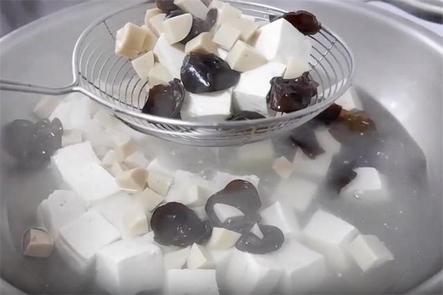 6.然后把豆腐下锅煮一下,煮开之后,再加入木耳、火腿肠,煮个一分钟之后,就可以捞出了。