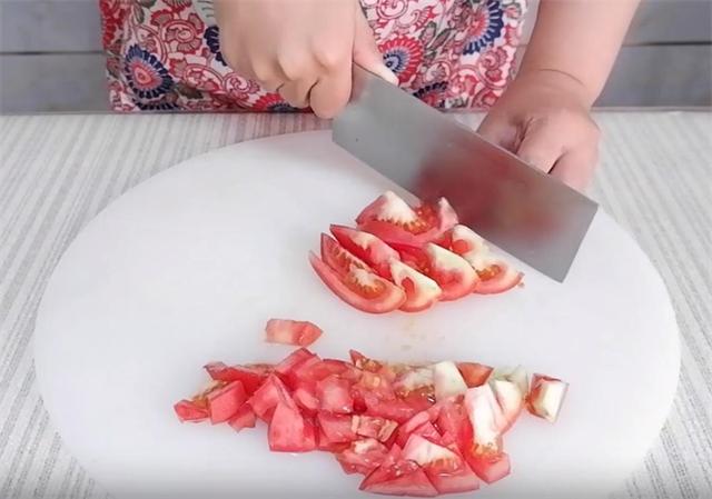 4.准备一个西红柿对切,把一半切碎丁,一半切大块。