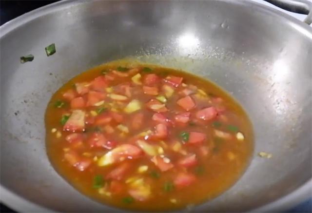7.接着另起锅,加入少量的油,加葱姜蒜炒香,然后下入西红柿碎炒出汤,再加入少量的番茄酱炒匀,接着倒入料汁煮开。