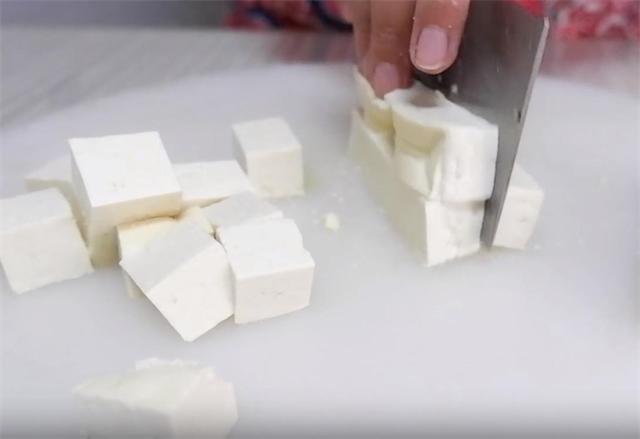 1.朋友们,大家,今天做一个超级给力的蒜香豆腐,外酥里嫩,好吃下饭。准备一块老豆腐,先改刀切成小块。