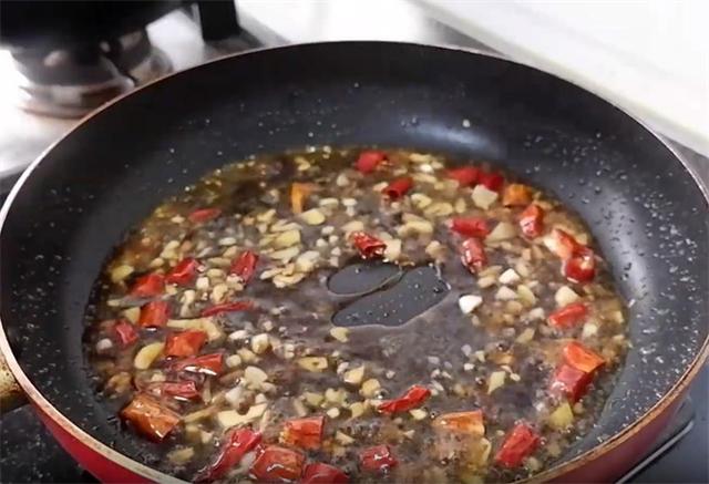 3.然后在锅中再加少量的油,加多一点的蒜末、干辣椒段,慢慢炸香之后,加入一碗水,再加入盐、酱油、素蚝油、老抽煮开。来源: www.ws46.com