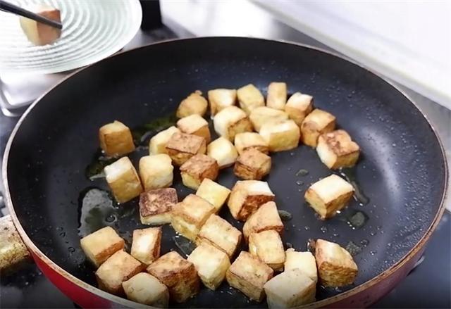 2.接着准备平底锅,加多一点的油,把豆腐下锅煎一下,煎的时候一直用中火把豆腐表面煎至金黄,煎的时候要勤翻面,煎好之后取出。