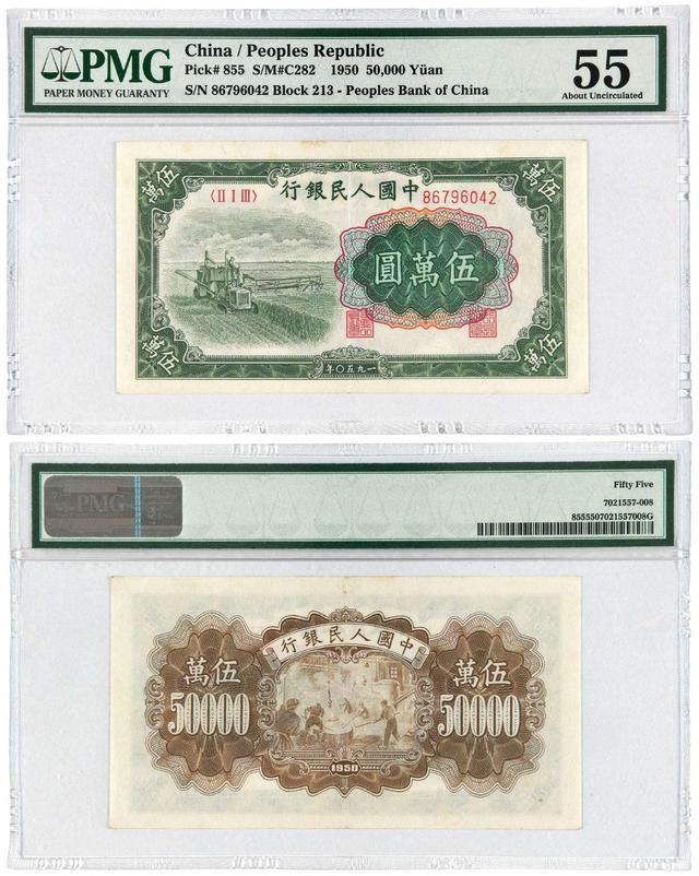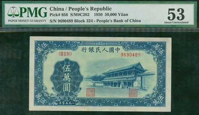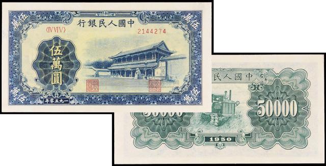 今天要和大家说的5万元收割机纸币,它也是一版币中最大的面值,同期还有一张是5万元的新华门,它们分别在上海和北京印制,其中币面有收割机的要更为少见一些,5万元收割机的年份然是1950年,但他要等到1953年的年底才发行。