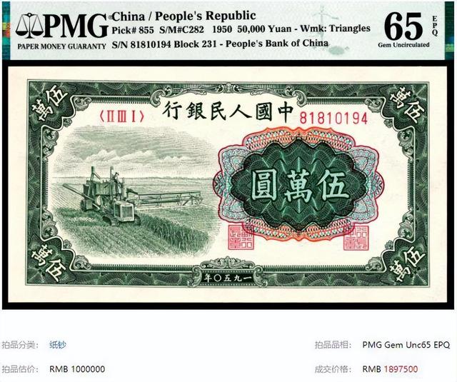 在去年的杭州和拍卖会中,一张全新的5万元收割机就拍出了189.75万,注意就算是破破烂烂的,它都要值好几万了,你家还留着这样面值的纸币吗? |