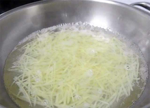4.土豆丝泡好之后,放入锅中煮一下,为了保证土豆丝脆的口感,水开煮个1到2分钟就可以捞出了。