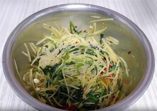 7.菠菜煮好之后,直接放入装土豆丝的盆中,然后再加入粉丝,加入蒜末、小米辣、一勺盐,少量的味精,再加稍多一点的酱油,少量的陈醋,多一点的辣椒油,完全拌匀,然后装盘。