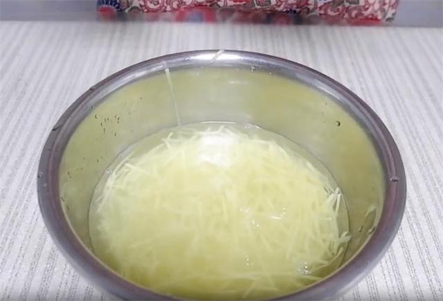 2.然后准备一个土豆,用工具擦成丝,土豆丝直接放在水中泡20分钟,去一下淀粉。