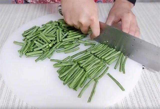 1.朋友们,大家好,今天咱们做一个好吃的凉拌豇豆,准备一把豇豆,洗净切成小段。