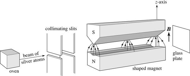 不过当时的物理学家认为,空间量子化只是一个中间步骤,我们只是利用它来推导能级。一旦能级推导出来后,这个东西就可以不用去管。因此,当时没有人会想要去验证空间量子化是否正确。 恰巧有一天,斯特恩去听了一个关于原子物理的报告,报告人讲的就是空间量子化的想法。当时,报告人也强调了这只是一个中间步骤。不过,斯特恩是搞分子扩散的,用今天的话说就是同位素分离。在电场和磁场作用下,较重的同位素跑得较慢,较轻的跑得较快,它们就会分别沉积在不同的位置。 斯特恩对于量子力学来说就是外行,所以他在听完报告后并没有像其他物理学家一样,而是想着如何用实验来验证空间量子化。很快,斯特恩就想出了一个实验,具体步骤如下: 用一个炉子加热一些银原子,使它们蒸发成为原子束,然后用一个准直孔将原子束变成一束平行的原子流; 用一个非均匀的磁场,例如两个相反的磁极,对原子流施加一个垂直于原子流方向的力,使原子流发生偏转。 用一个屏幕来接收偏转后的原子流,并记录原子的落点分布。 为什么使用银原子来做实验呢?因为报告上说了,当时认为银原子的基态角动量L=ℏ。在磁场的作用下,根据电磁知识可以计算出银原子所受到的力为 :
