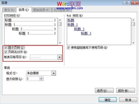 ④设置你要的目录样式,包括显示页码、页码对齐还有制表符的选择。