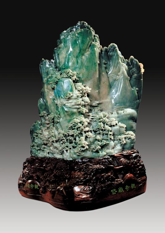 翡翠界的四大国宝。 第一岱岳奇观,高88厘米,充分展现了泰山的雄伟气势和盎然的景色,采用镂雕、圆雕、深浅浮雕,体现层层叠叠的山峦和树木,作品背面刻有杜甫的《望岳》,气势恢宏。