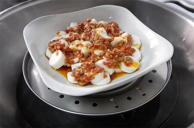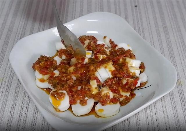 1.朋友大家好,今天咱们做一个好吃的剁椒蒸山药。准备几勺好吃的剁椒酱,浇上半勺热油,再加少量的味精搅匀备用。