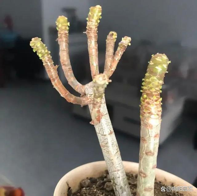 经过一个夏天,法师变成光杆司令了,叶子都没了,秋天还会长漫长的夏季终于过去了,立秋过后大概还会持续30~40天左右的高温天气,好在立秋过后,只是白天的温度很高,夜间的气候温度会相对凉快一些,放在室外养的多肉,也会更安全了,夏天高温对多肉的影响是巨大的,比如说景天多肉,大多数的景天多肉树高温影响叶子都会出现化水,还有部分的多肉受高温影响,叶子会自然的脱落。  法师这个品种,到了夏天受到温度影响,当温度上升到30度以上的时候,法师的叶子就开始逐渐的脱落,慢慢的顶端的叶子会全部脱落掉没,整个法师也就变成了光杆司令,没有了叶子,只剩下了光秃秃的枝干,这也是法师进入休眠期的表现。 正常的情况下,在每年的7月份,法师的叶子就开始脱落,一直到八九月份,在这期间法师都是没有任何叶片的,等到9月份过去,气温开始逐渐下降的时候,法师进入到生长期这个时候,新的叶子就会逐渐的伸展开,等到10月份11月份法师的叶子就会完全展开了。 掉叶子是法师休眠的表现,当它的叶子开始掉落的时候,就已经要做到完全断水了,休眠期间的法师可以放在没有太阳光的地方进行阴养,没有光照减少水分的消耗,更有利于法师休眠,在整个夏天法师都不需要浇水,如果一旦浇了水,那么法师的主干很快就会黑腐掉。 www.ws46.com 等到秋天的来临,气温开始逐渐下降,法师的叶子开始逐渐恢复生长,这个时候再进行加大浇水,只要没有叶子,就不需要浇水,新叶子生长出来,再及时的进行补充水分,法师的生长季节主要集中在秋冬季节,温度在十七八度的时候是法师生长速度最快的时候。 现如今市场上对于法师的销售数量虽然并不是很多了,喜欢养殖法师的花友也是越来越少,只有极少数的多肉花友才会去选购法师,像这一类老的多肉种类,慢慢的就会被市场所淘汰,在景天多肉植物中,很多的多肉品种慢慢的都就淘汰掉了,因此,也不太建议大家在今后去购买法师了。 市场上所淘汰的多肉种类,必然本身就存在着很多的弊端,在整个养护期间,所出现的死亡率必然也是最高的,如果再继续花费金钱去购买,也就完全没有养殖的意义了,不如选购市面上的新品种,至少要比法师更具备养护的价值。