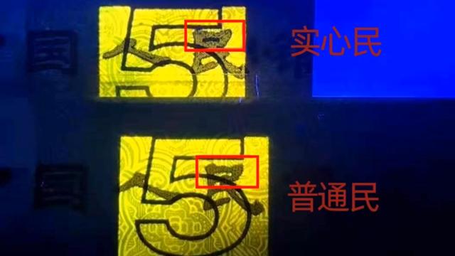 目前他们还是发现了一个版别,就是图片当中展示的这张实心民版,这种版别如果不打荧光灯说,就是神仙来了也看不出实心民在那里,打一紫光灯就能看得很清楚,所谓的实习民就是民字中间是黑心的,而普通的民字是空心的,就这么一个差距就形成了一个新的版别,当然这种版别如果是普通的收藏爱好者发现了,那就不一定是个版别了。