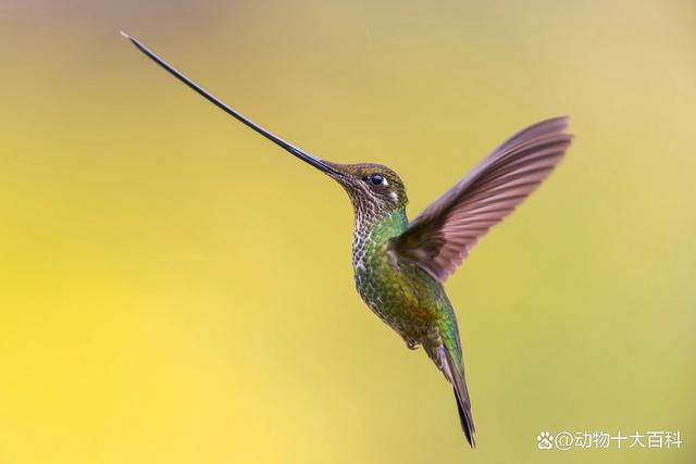 “洪水导致向日葵田无法收割,成千上万的鸟类,包括绿翅雀 ( Chloris loris )、金翅雀 ( Caruelis carduelis ) 和黑斑雀 (Bramblings),在冬天聚集到这里。 尽管它们色彩缤纷的羽毛使它们很容易成为目标,但在觅食时它们的颜色与周围环境融为一体,使捕食者很难发现它们。我使用覆盖着雪和干向日葵的广角镜头,从布兰布林的角度拍摄了一群布兰布林,其中一只栖息在我的相机前。 Fujifilm X-T2 配备 Fujifilm 10–24mm f/4 镜头。10毫米;1/680秒;f/11;ISO 1,600。 5、飞行中的鸟获胜者 剑嘴蜂鸟Ensifera ensifera。哥伦比亚波哥大。 拉斐尔·阿玛达,西班牙。