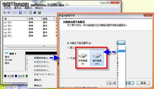 三、创建虚拟盘符 在Windows7系统中,创建好虚拟磁盘后,还可以为虚拟磁盘分配一个盘符,鼠标右键单击新建好的,并经过“初始化”的虚拟磁盘,在弹出菜单中选择“新建简单卷”,启动“新建简单卷向导”,在向导带领下指定卷大小、分配驱动器号、格式化……,最后单击“完成”按钮,完成卷的创建,打开“计算机”窗口,可以看到“虚拟磁盘”(如图 3)。