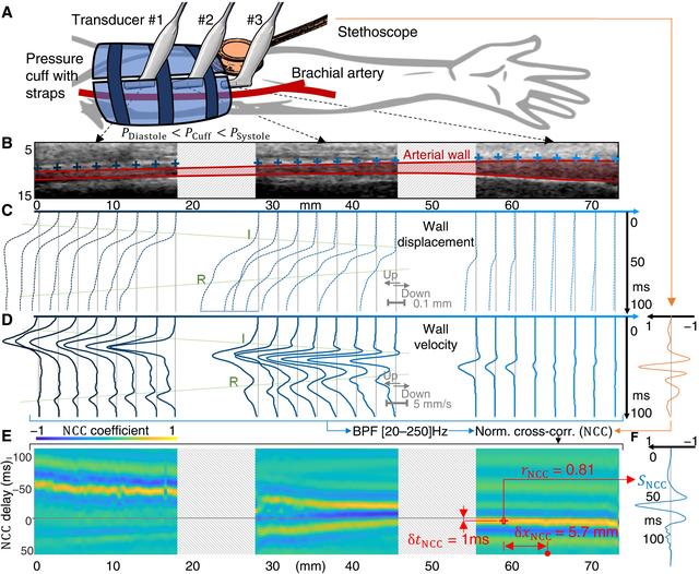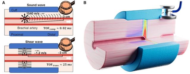 他发现,当气囊的压力高于收缩压时,动脉被完全压闭血流停止,听诊器里没有声音;当气囊的压力降低到收缩压时,动脉开始重新开放血流恢复,听诊器里出现了一种敲击声,这就是第一阶段的科罗托科夫声音;当气囊的压力继续降低到舒张压时,动脉完全开放血流平稳,听诊器里的声音消失,这就是第五阶段的科罗托科夫声音。通过记录这两个压力值,我们就可以得到血压的读数。 这种方法看起来很简单,但是它有一个很大的问题,那就是我们并不清楚科罗托科夫声音是怎么产生的。这些声音是从动脉里发出来的吗?还是从周围的组织里发出来的?它们是由什么物理现象引起的?这些问题在过去的一个多世纪里一直没有得到确切的答案,这也导致了血压测量的一些局限性,比如测量的准确性、重复性、可靠性等。来源: www.ws46.com 为了解决这个问题,一些法国的物理学家和医学家合作进行了一项创新的实验,他们用一种叫做超快超声的技术,可以以每秒数千张的速度拍摄动脉的图像,同时也记录了听诊器里的声音。 首先,他们用一个气囊包裹在一个志愿者的手臂上,然后用一个超声探头放在气囊下方的动脉上,同时用一个听诊器放在探头的旁边。他们开始给气囊充气,直到压力高于收缩压,然后逐渐放气,直到压力低于舒张压。在这个过程中,他们用超声探头拍摄了动脉的图像,用听诊器记录了声音。他们把这些数据同步起来,就可以看到动脉的形变和声音的变化之间的关系。