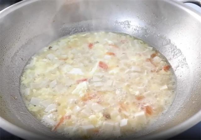 4.接着加入一大碗水煮开,然后加入火腿肠煮个两分钟,最后再淋入少量的水淀粉勾芡,加盐调味就可以出锅了。