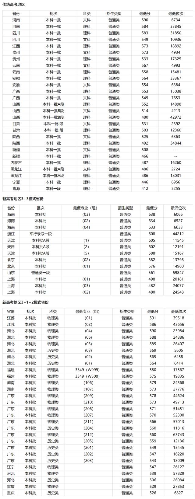 西南石油大学在2023年的高考中,四川理科最低分是583分,文科是549分。在传统高考地区,都是本科一批次录取,最低分从412分(青海)到590分(河南)内。 在新高考地区采用3 3模式的省份,最低分数线在480分(上海)到638分(海南)范围内。 在新高考地区采用3 1 2模式的省份,最低分数线在506分(河北)到591分(江苏)左右。 具体分数线见下面。