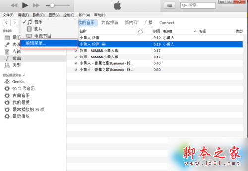 6、编辑ituns菜单,增加铃声菜单的显示 a. 在ituns菜单栏下一行,点击选择编辑菜单 b. 勾选铃声选项,点击完成